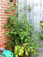 Whilst visiting the in laws a couple of weeks ago, I noticed that my mother-in-law had stripped her tomato plants of leaves, leaving just the tomatoes on the bare vines. She told me that at this time of year you need to stop the plants putting their energy into growing to allow the fruit to ripen. Thinking about it, it did make sense. Also, as the nights are drawing in and the sun is losing its strength, the tomatoes need all the light exposure they can get to ripen, so being shaded behind foliage doesn't help.